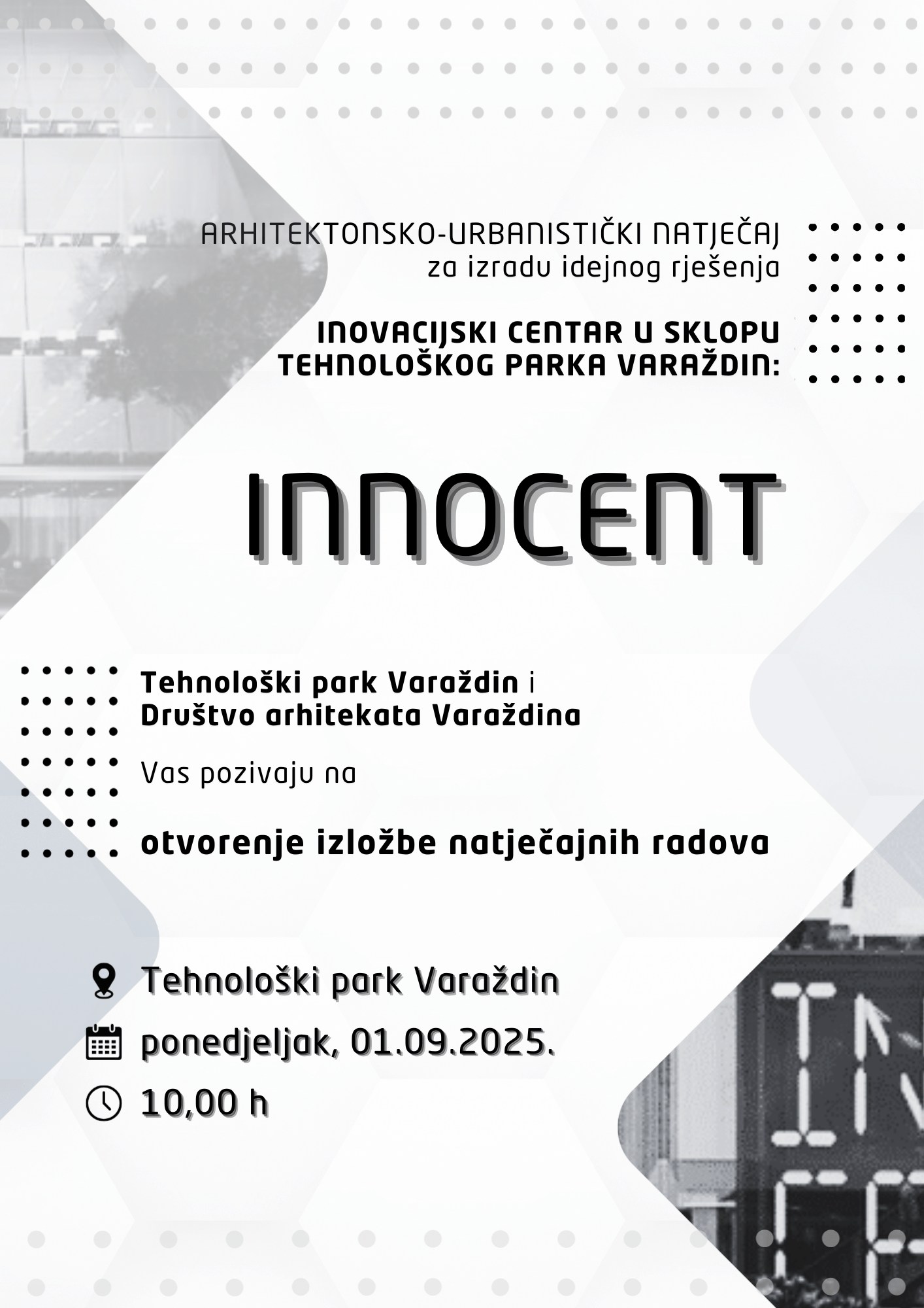 Pozivamo vas da u ponedjeljak i utorak, 1. i 2.9.2025. U Tehnološkom parku u Varaždinu pogledate izložbu radova pristiglih na arhitektonsko-uranistički natječaj za novu zgradu Tehnološkog parka! Otvorenje izložbe je u 1.9. u 10:00h, a izložbu je moguće pogledati tokom radnog vremena.